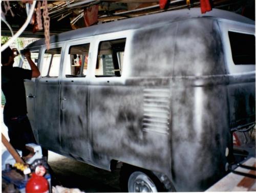 All rust cut out and repaired by panel beater. Sprayed undercoat with white around windows.