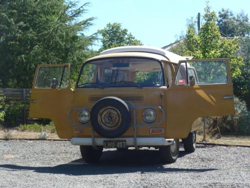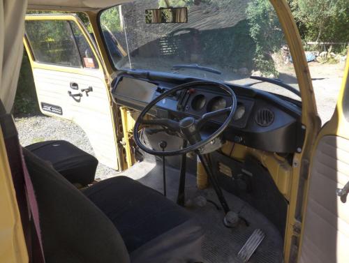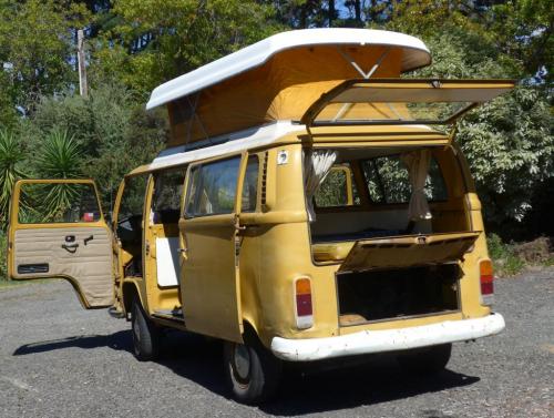 This vehicle was built in Australia in 1972 and is an original part camper conversion. That means it has a pop top roof and a back seat that folds into a bed, with an additional bed sleeping two more up top. It has a 1600cc engine.
