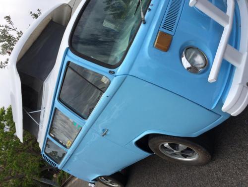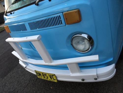 We have completely repaired any rust we could find - mainly behind the wheel arches, and the window sill behind the driver. The gas bottle vent has been replaced as well as the old water tank filler. We have resprayed the bottom half in one of our favourite VW colours - Flipper blue. All the rust and paintwork was completed by our panel beater/spray painter who has over 33 years professional experience. All work was completed under our personal supervision so we could ensure the job was completed to our satisfaction. The paintwork was completed in quality 2K Dupont and was completely cut and buffed before waxing to give it a final protection and shine.