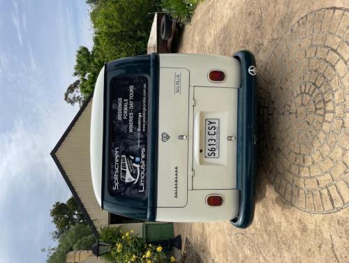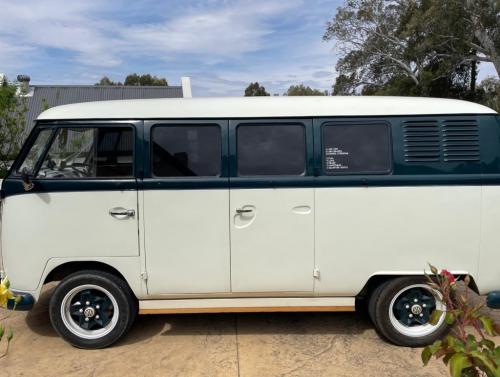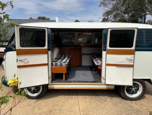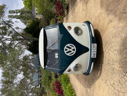 Hahndorf SA Nautilus is a Volkswagen VW split screen Kombi with 3 windows finished in stunning green and ivory.