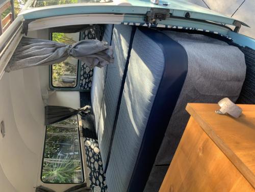 Kevi currently has a rock and red bed and set up for a weekender but can be easily converted into an 8 seater to her original form.